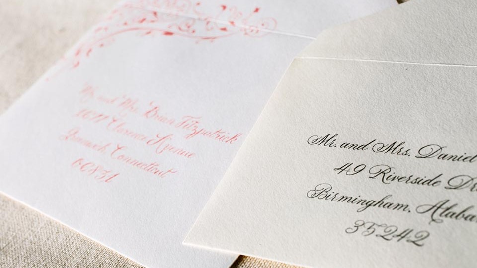 Allow us to digitally print your guests’ names on your envelopes. We now offer digitally printed recipient addressing on all of our envelope sizes. Let us know if you’d like to use this service, and we’ll send you a form to fill out with all of your guests’ addresses.  We’ll match the fonts from your invitations to create a perfectly coordinated set. Inner envelopes are $1 each, outer envelopes are $2 each (or $3 each for a recipient address + a return address).